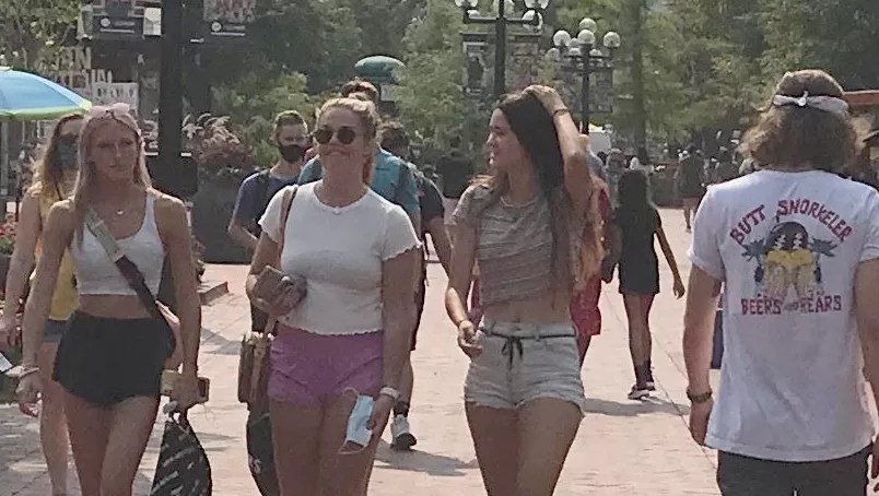 The Pearl Street Mall looked less like a flashback to the pre-COVID-19 days. Around 40 percent of those on hand skipped masks, with most of them traveling in packs – some including moms, dads and younger siblings, others dominated by teens and early-twenty-somethings. And at street crossings, folks were often shoulder to shoulder whether their mugs were cloaked or not.