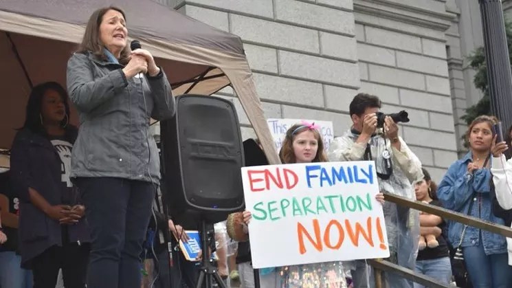 Diana DeGette speaking out against family separation at an event in June.