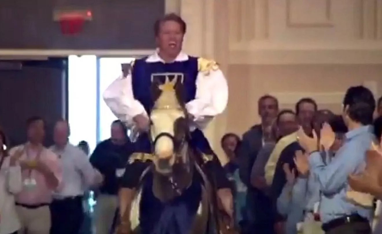 Oliver described Thiry as a “showboating musketeer,” and for good reason: Videos of company events show Thiry dressed in medieval garb while making splashy entrances; he rode in on a horse at one bash, and did tumbling moves to Bob Seger’s “Old Time Rock & Roll” in another. The former Bain & Company powerhouse’s choice of wardrobe was influenced by his love of the movie The Man in the Iron Mask, and he got a jolt out of getting his employees to chant “All for one and one for all.”