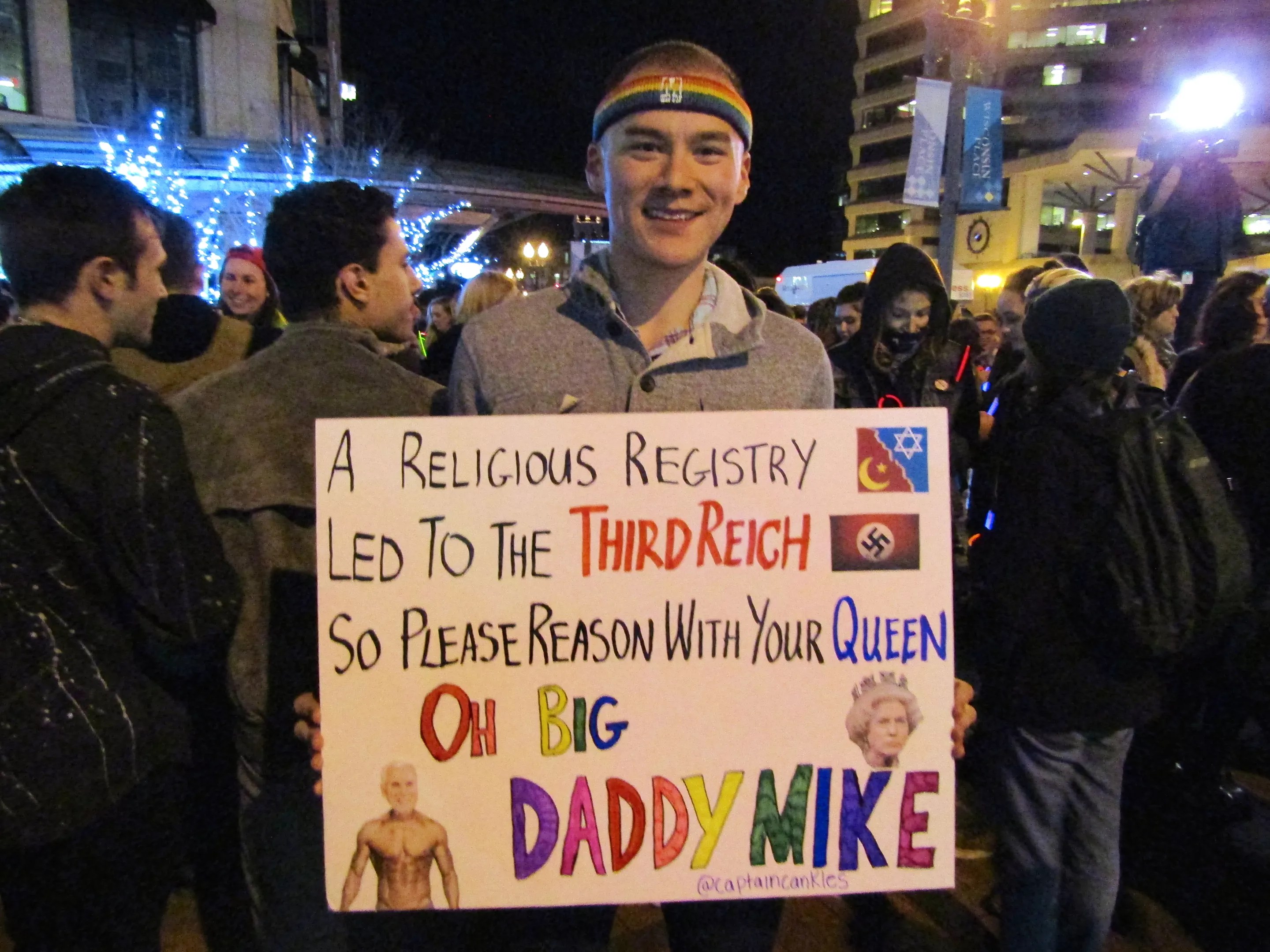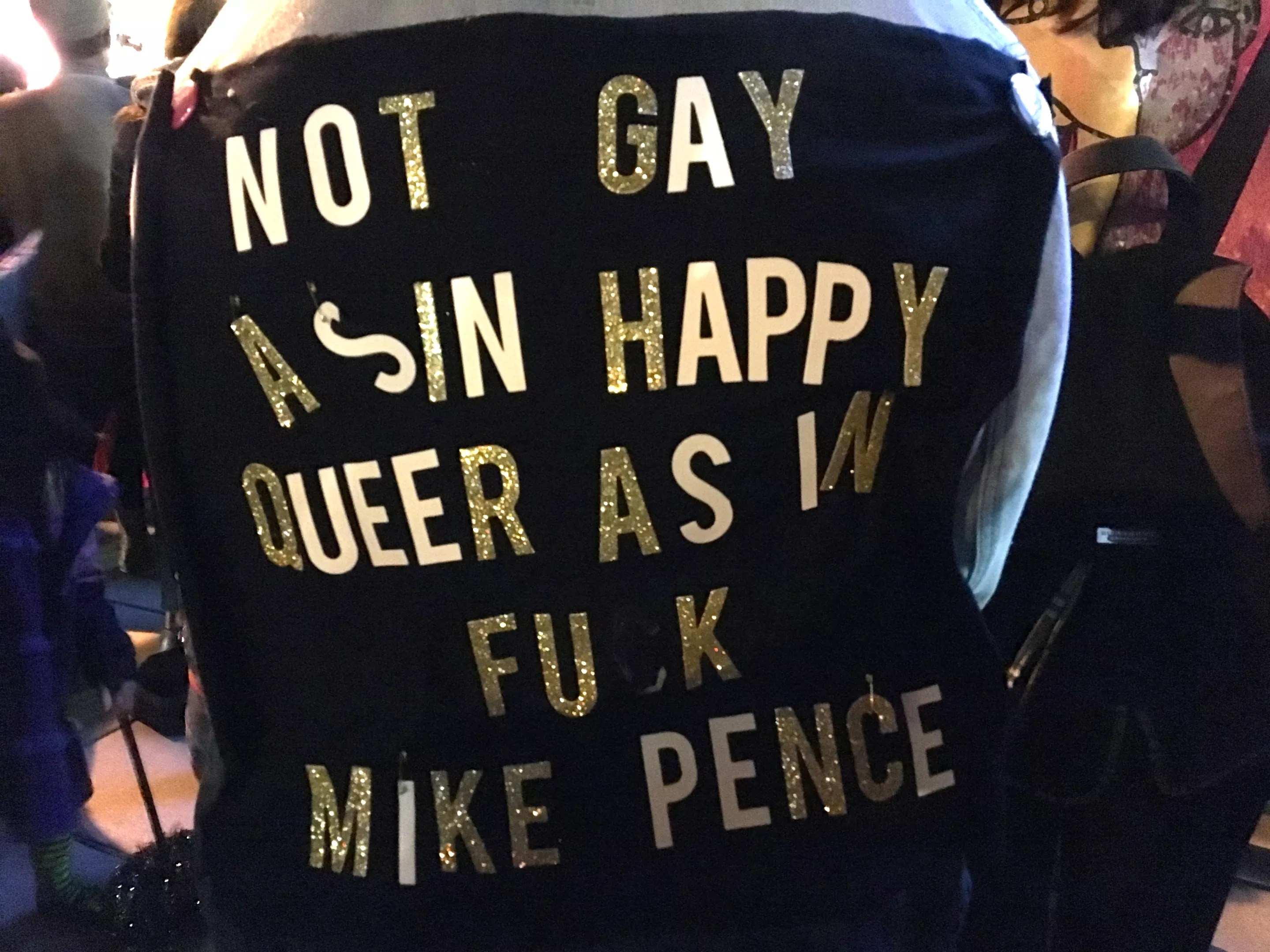 Behind us, a dancer climbed up on top of the truck with the speaker system and twirled with his hands spread in a Y shape above his head. “DADDY PENCE, FUCK PENCE. DADDY PENCE, FUCK PENCE,” shouted people around him.