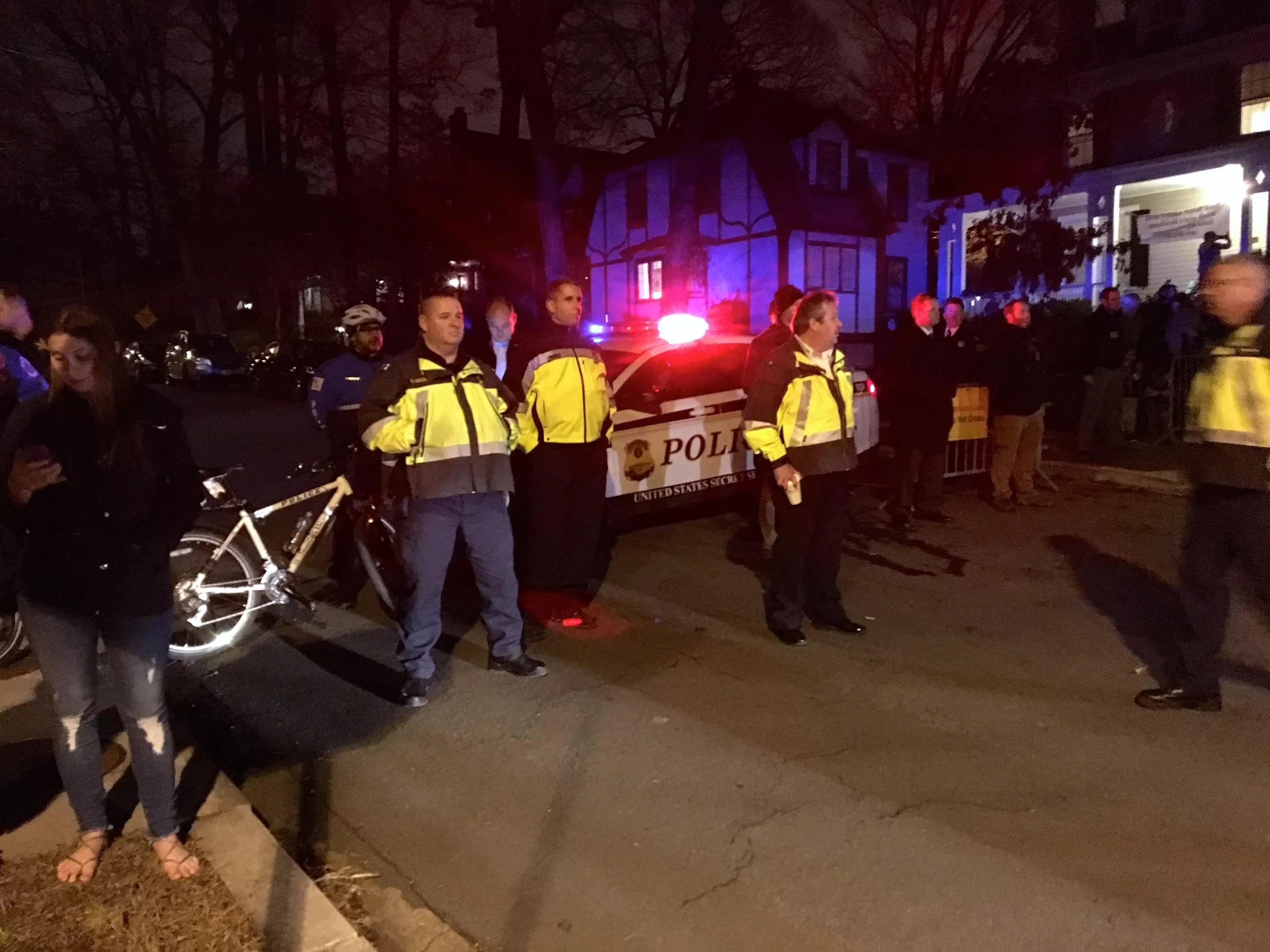 I knew we were close to Pence’s house when I saw the flashing lights ahead. And as we passed the police cruisers, we saw a barricade manned by Secret Service agents at the entrance to a smaller side street called Tennyson.