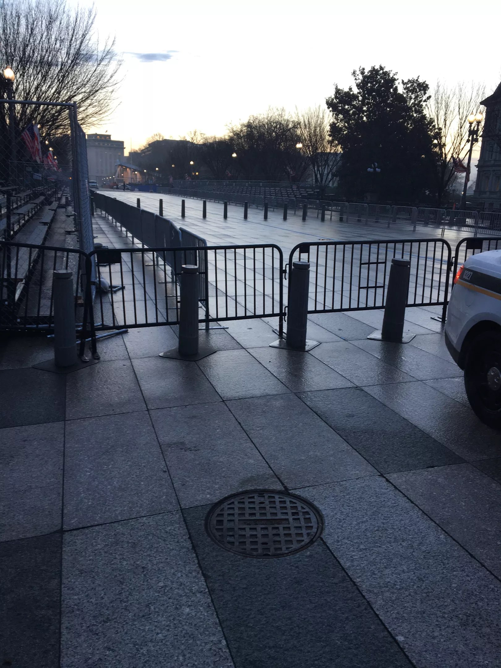 Because my friend’s workplace is along the main parade route, the sidewalk in front of her office was already lined with ten-foot-tall, see-through reinforced steel barriers.