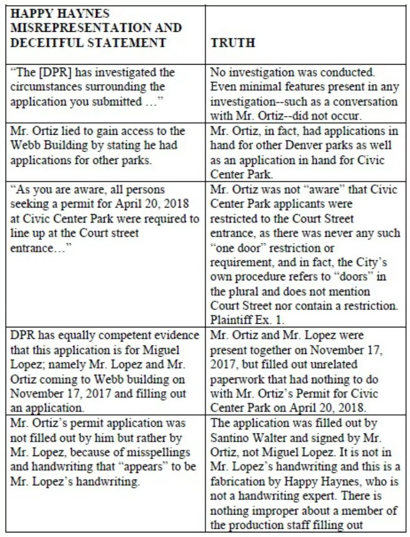 To put it mildly, Corry and company disagree with this characterization and accuse Haynes of being less than honest in an effort to deny Ortiz’s rights. Here’s a segment of the suit that juxtaposes Hanes’s statements, labeled as “deceitful,” with the “truth:”