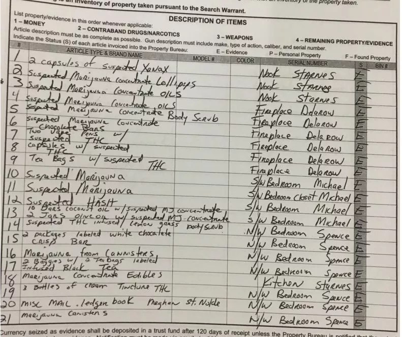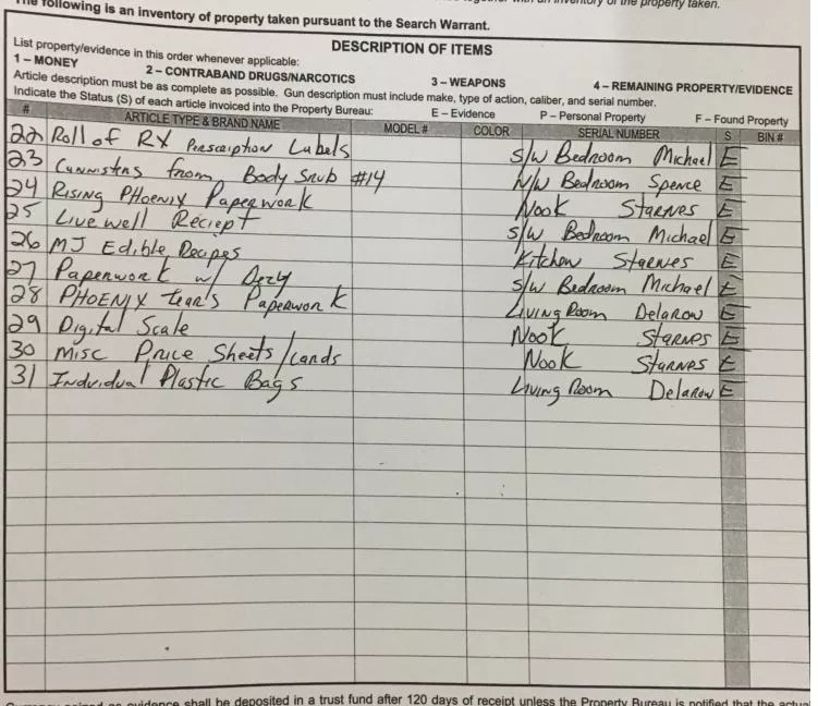 An inventory of items taken during the search of Queen Phoenix’s home in December.