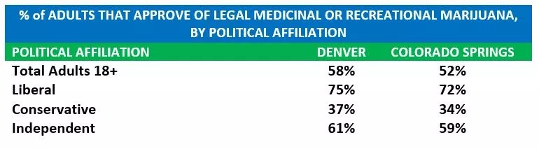 Despite the differences between the two cities, residents of Denver and Colorado Springs share many similarities when it comes to cannabis consumption, according to a new study by Consumer Research Around Cannabis, a research firm that conducts over 100,000 surveys a year on consumer trends. That study found that in both Denver and Colorado Springs, a majority of the residents are in favor of legal pot, and the breakdown by political affiliation is very similar in the two cities.