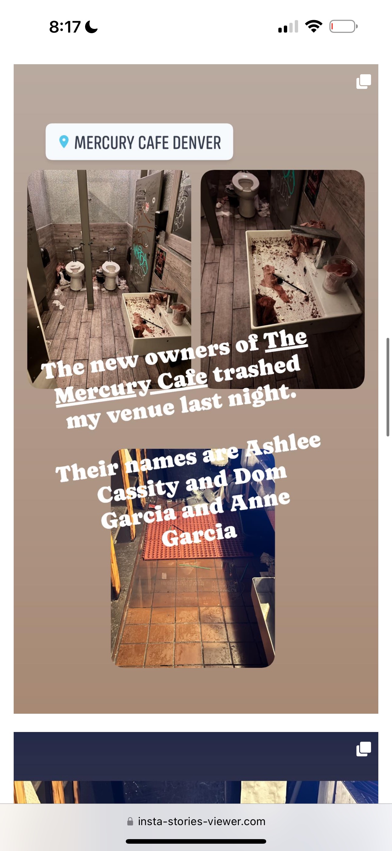 The next day, Johnson posted photos on social media along with the full names of Cassity and both Garcias while tagging Mora and the Mercury Cafe, saying the future owners of the Merc had trashed her bar.  “They deserve that,” Johnson says. “I’m not going on to social media to cancel anybody. I’m just stating truths. I’m stating pictures and the videos that we have when we walked into the venue, when we were trying to be amicable and professional, and they trashed it.”