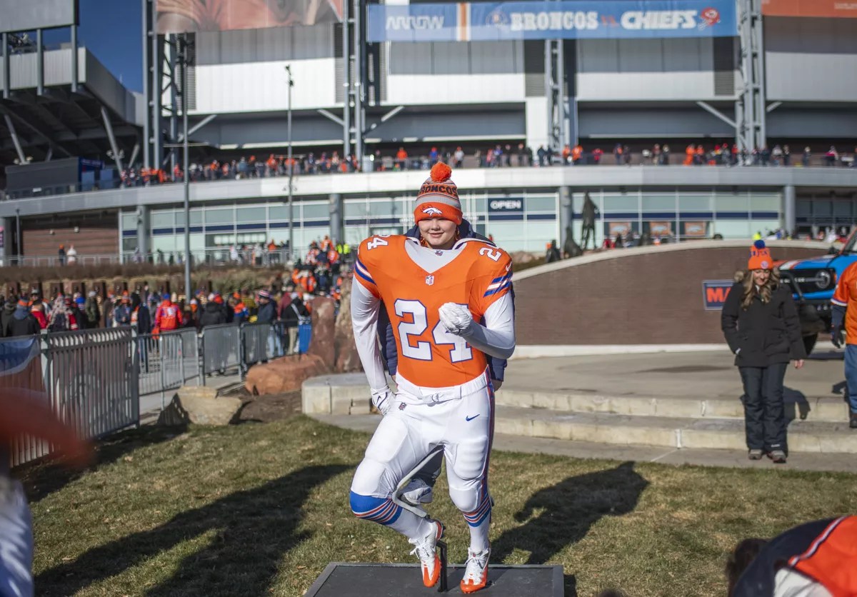 Denver Broncos fans wearing rookie quarterback Bo Nix’s number 10 jersey.