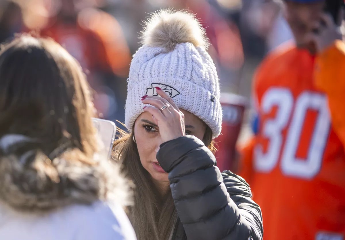 Crowds of Denver Bronco and Kansas City Chiefs fans outside Empower Field on January 5.