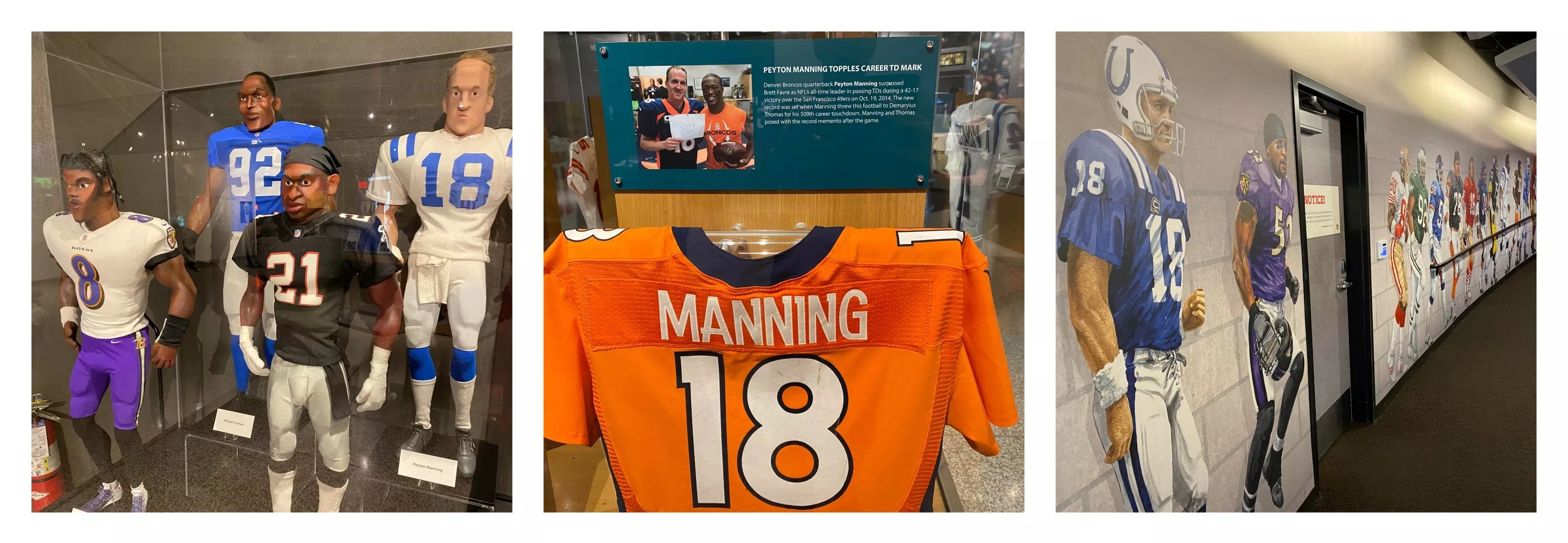 (From left): A doll of Peyton Manning (in his Indianapolis Colts uniform) used in a popular television commercial; a Peyton Manning jersey accompanied by a photo of him with Demaryius Thomas as they celebrated his record-setting 509th touchdown pass; a mural showing the evolution of football, from Jim Thorpe to (naturally) Peyton Manning.