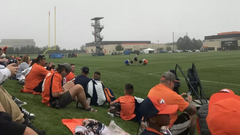 Hence, our second rookie mistake. Lora and I wore short-sleeve Broncos shirts – mine from the Super Bowl 50 season, Lora’s a Von jersey – and shorts, with no jackets or blankets for seating comfort on the grassy hillside that serves as the equivalent of bleachers at camp. Given that practice wasn’t scheduled to start until 9:30 a.m., we got the thrilling opportunity to freeze our asses off for hours.