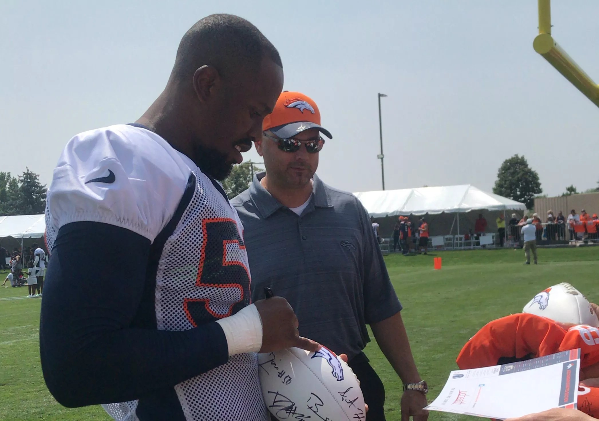 As practice wound down, our instructor returned to share the rules of autograph-seeking. Broncos personnel would hold up a yellow rope at the edge of the field, he told us – and we were not to push, shove or otherwise act like idiots while attempting to belly up to it. After that, players who wanted to would stop by and sign items of every description.