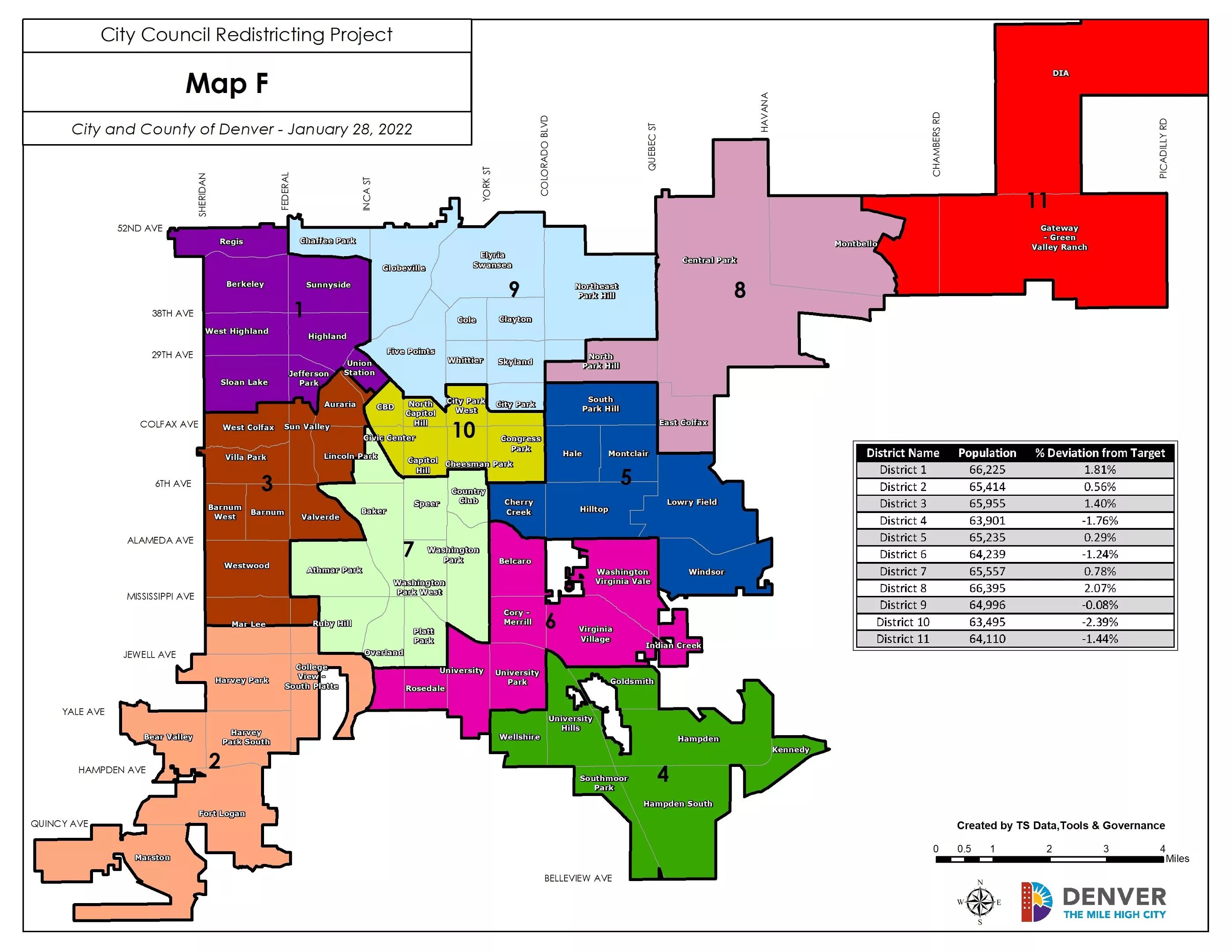 While redistricting at the state legislature and congressional levels can often involve heavy gerrymandering along partisan lines to give Republicans or Democrats an advantage, the City of Denver doesn’t have to worry about such political maneuvering. Denver elections are non-partisan, and every member of Denver City Council these days is a Democrat, anyway.