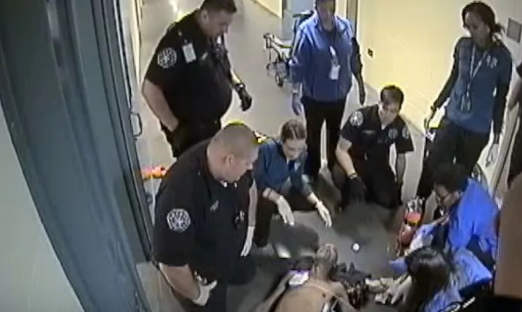 Deputies and emergency personnel looking at the lifeless body of Michael Marshall, as seen in surveillance video.