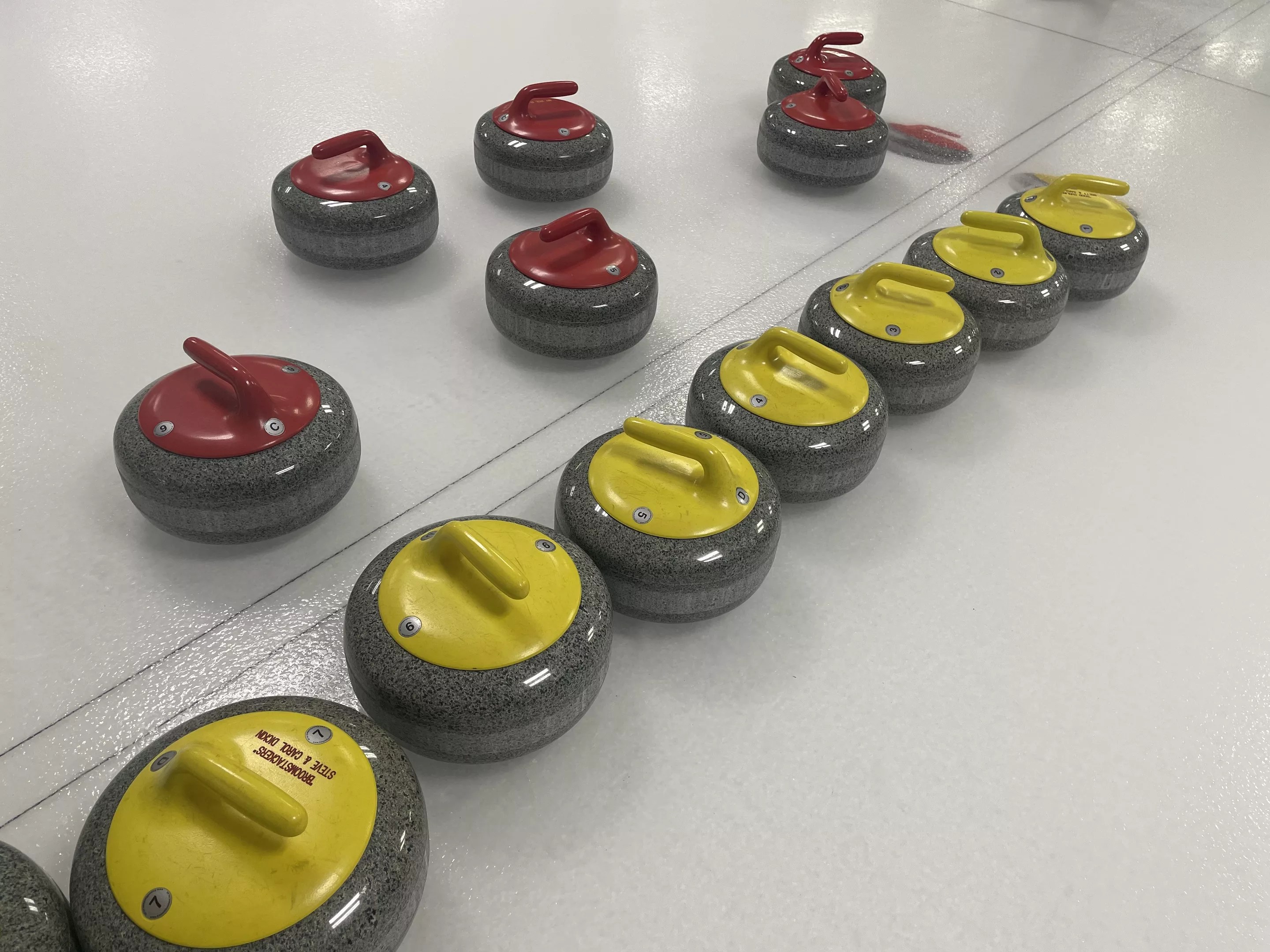 A curling game consists of a set number of ends, in which each member of the two four-person teams throws a stone twice. In each end, only one team scores. The scoring team is the one that gets a stone closest to the center of the target on the ice, called the house. The center is called the button, which sits at the intersection of the center line and the tee line, and two of what are called “hog lines” are drawn 21 feet from the center of the tee line.