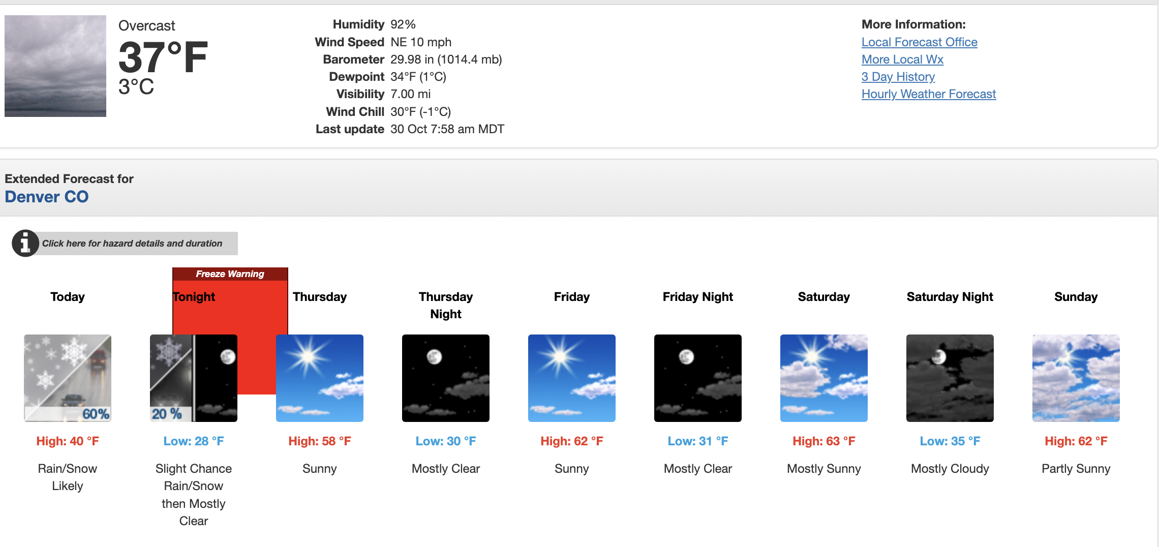 Although Wednesday, October 30, was the truly scary weather day this week, with frigid temperatures and mild precipitation, the predicted high for Denver on Halloween is just 59 degrees. That peak temperature will have passed before most people are off work and ready to embrace the holiday, though.