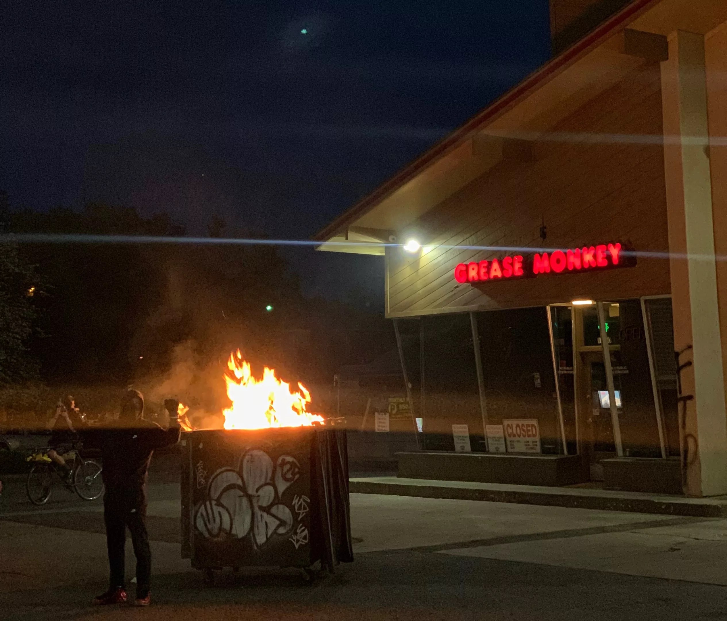 A protester holds his fists up in front of a burning dumpster on the night of May 31 on the corner of Corona and Colfax.