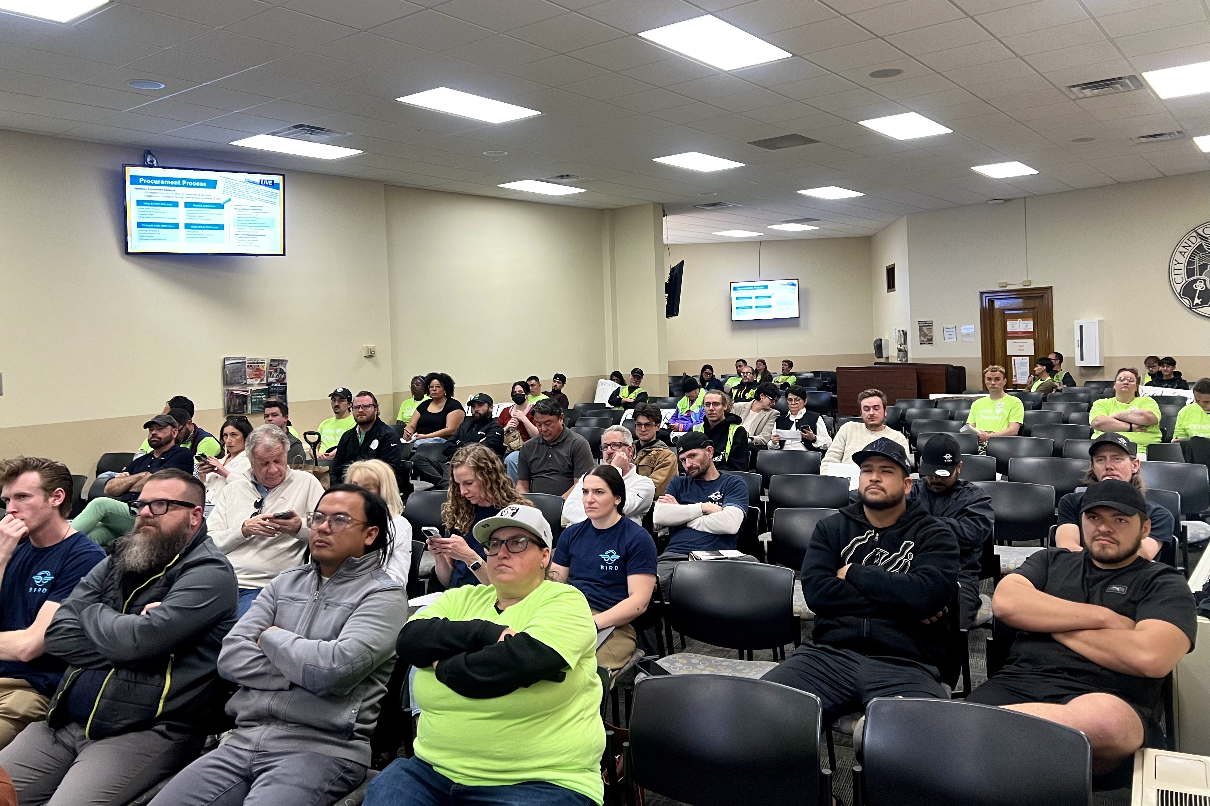 During the March 18 meeting, the conference room audience was packed with attendees in neon green T-shirts, signaling their support for Lime. For the next meeting on April 1, Veo apparently arrived early, filling the room with dozens of people in black Veo T-shirts, while those sporting Lime and Bird merch were relegated to an overflow room upstairs. Organizers with Lime paced the crowd of around sixty people, handing out free shirts and handwritten signs to anyone who wanted them.