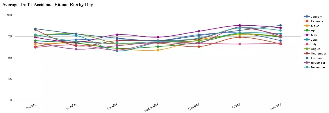 The map also shows that, on average, there are more hit-and-runs on Fridays, Saturdays and Sundays than any other days, suggesting that drivers who would have been better off calling a Lyft got behind the wheel anyhow and wound up smashing into something.