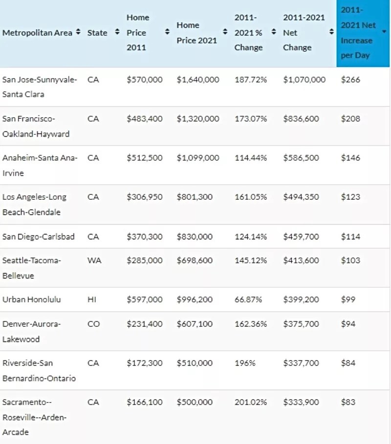By last year, the median single-family home price had topped $1 million in three California cities – San Jose, San Francisco and Anaheim – thanks to jaw-dropping spikes. For instance, the median price in San Jose went from $570,000 in 2011 to $1,640,000 in 2021; the overall $1,070,000 jump translates to $266 per day. And earlier this year, Honolulu joined the $1 million median price club.
