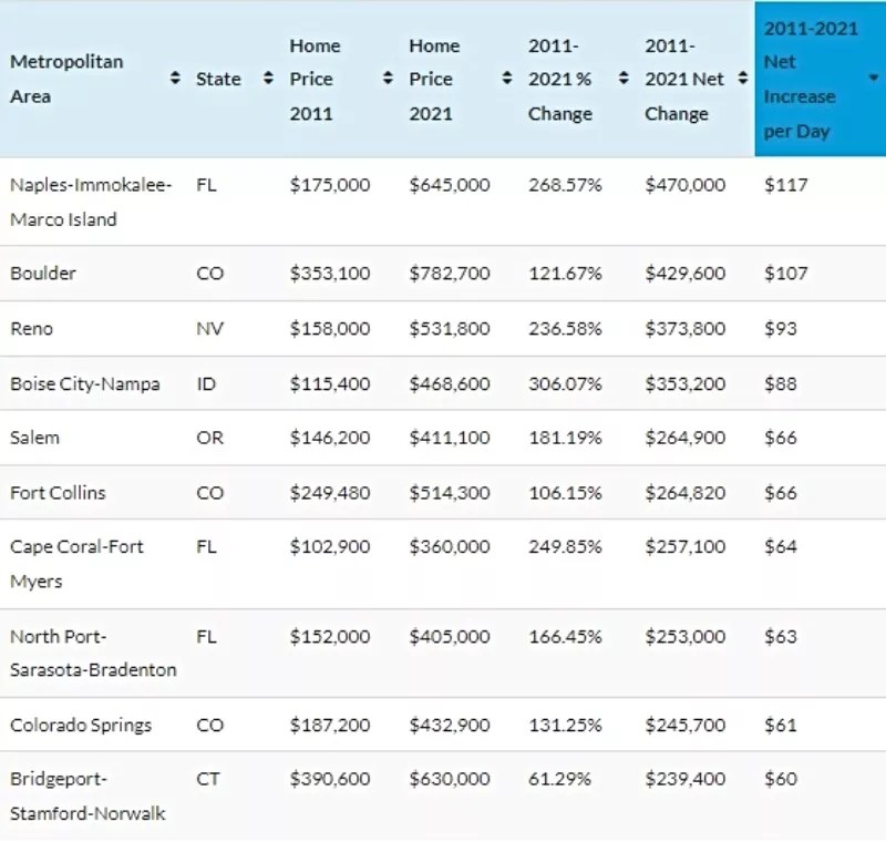 Meanwhile, the Denver-Aurora-Lakewood metropolitan statistical area made the top ten for large metros, winding up in the eighth slot by virtue of a median single-family home price that went from $231,400 in 2011 to $607,100 in 2021. The difference of $375,700 represents a 162 percent upswing that worked out to an average price climb of $94 every day: