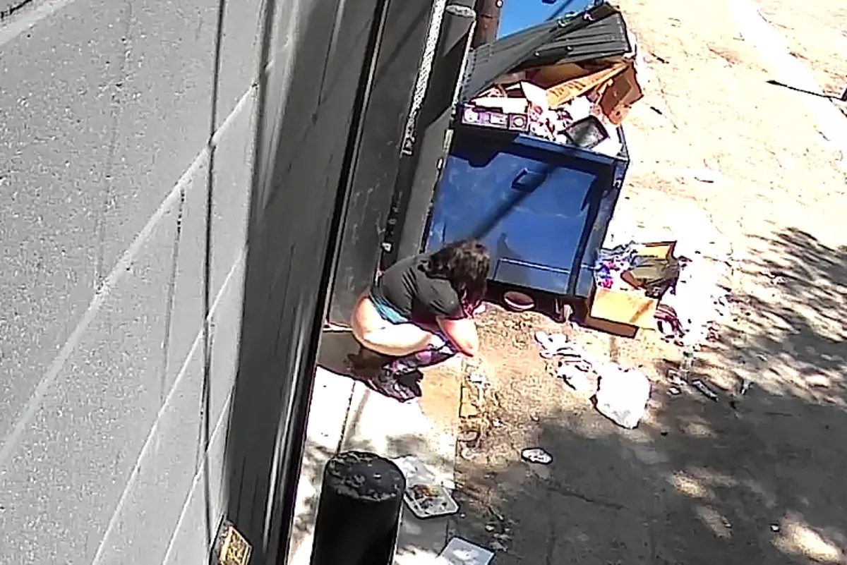 A woman was caught on camera pooping by a dumpster outside a business near 22nd and California, the site of one of Denver’s largest encampments.