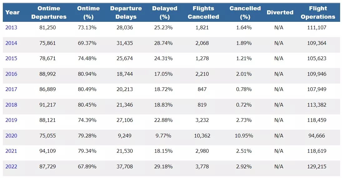 Here is the bureau’s arrivals chart for DIA from 2013-2022.
