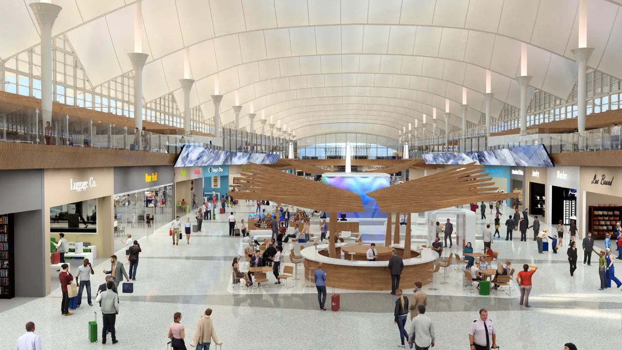 Public planning for the renovation of the Great Hall at Denver International Airport will take off today. In August 2017, Great Hall Partners – a team that includes Madrid-based Ferrovial Airports, Saunders Construction and JLC Infrastructure – signed a $650 million development deal with the airport authority, approved by Denver City Council, for the four-year redevelopment of Jeppesen Terminal. Part of a 34-year, $1.8 billion update of the airport, it calls for moving all security operations up to the north end of the sixth floor and opening up the Great Hall to more retail opportunities…but restricting two-thirds of that space to ticketed passengers.