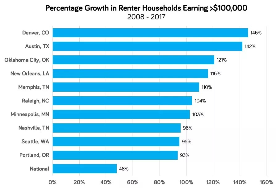 High-income renters who make more than $100,000 per year represent one of the fastest-growing segments of today’s rental market, and nowhere in the country has this phenomenon been more strongly felt than Denver. A recent study found that the Mile High City has seen a greater increase in this category by percentage than any other U.S. metro, with a boost of 146 percent over the past decade – well over triple the national average.