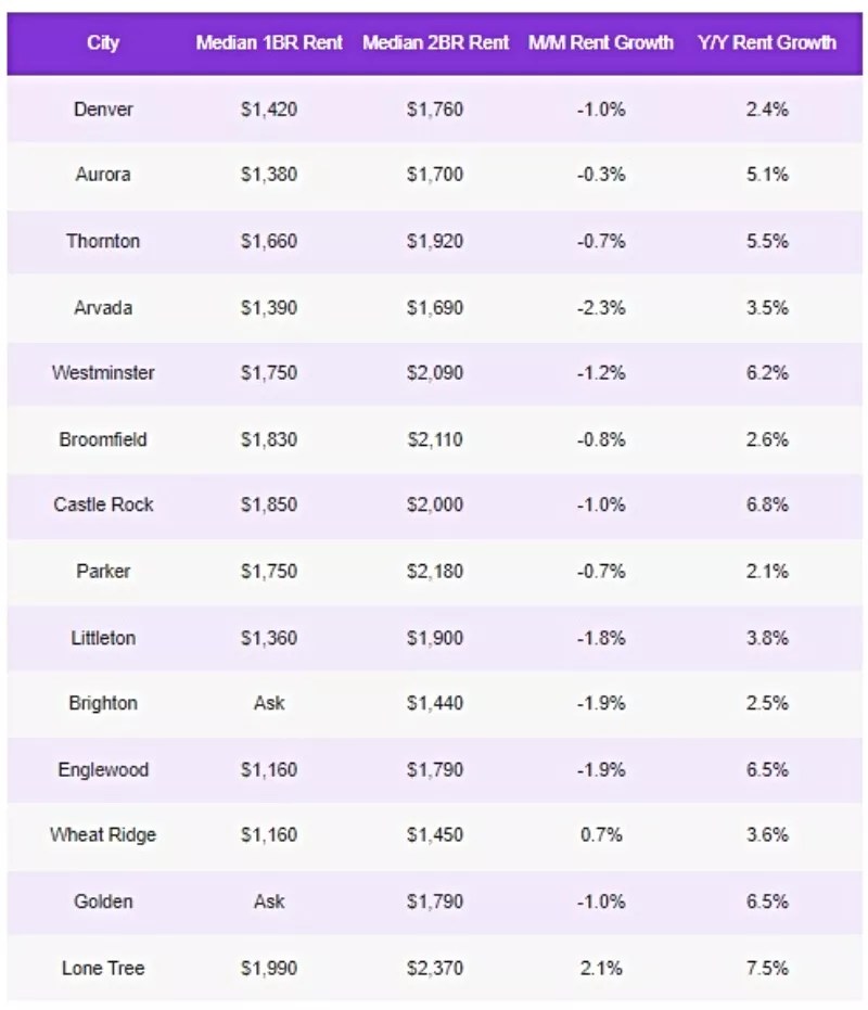 The annual rent hikes in the remaining towns ranged from a low of 2.6 percent in Broomfield to a high of 7.5 percent in Lone Tree, which also had the largest monthly rent increase, 2.1 percent, as well as the spendiest median-two-bedroom price tag, $2,370. The only other spot to register a rise was Wheat Ridge, climbing by 0.7 percent in October. Yet median one-bedroom rent in Wheat Ridge was $1,160, tied with Englewood for the most cost-friendly spot in greater Denver.