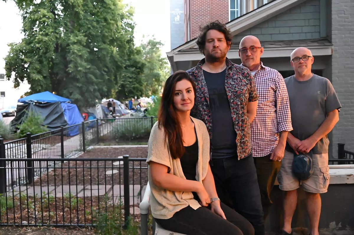 From left to right, Pakizé Arslani, Kyle Tilev, James Noone and Chris O’Reilly on the patio of one of their homes near the encampment by the Gathering Place.