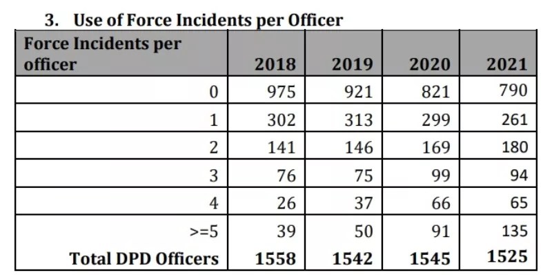 Over that same period, the number of DPD officers with multiple use-of-force incidents on their records also skyrocketed. In 2018, 39 officers registered five or more use-of-force incidents; the total in 2021 was 135.