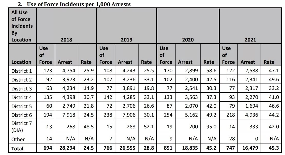 In other districts, use-of-force incidents rose in raw numbers from 2018 to 2021, despite a drop in arrests. During 2018, District 3 counted 63 use-of-force arrests among 4,234 arrests for a rate of 14.9 percent; in 2021, that same district documented 77 use-of-force arrests among 2,317 arrests, for a rate of 33.2 percent, up from 30.3 percent in 2020.