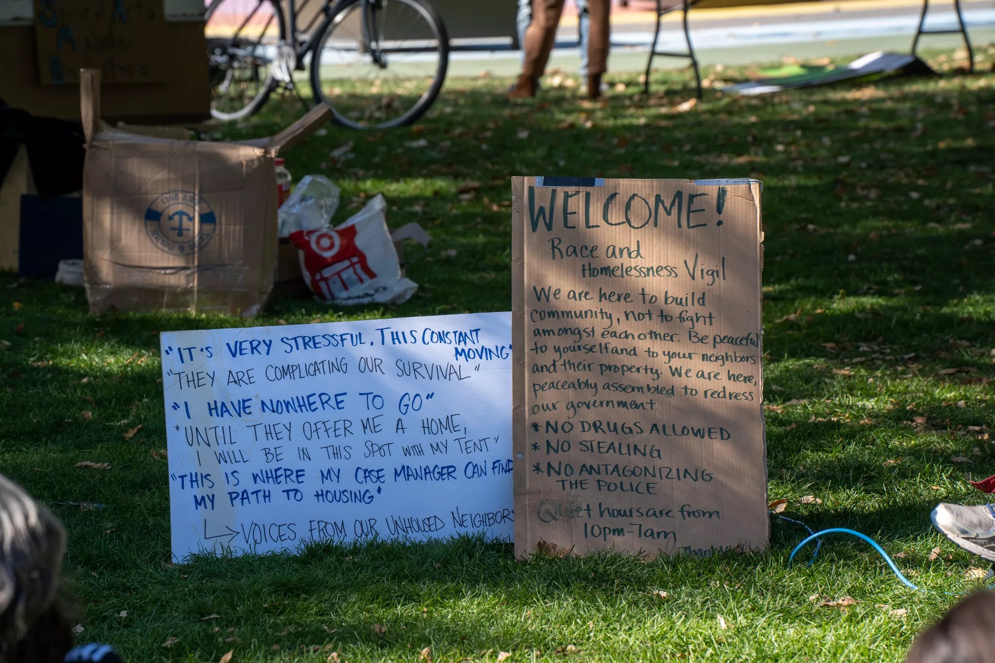 Early on October 16, a woman was organizing her belongings on the steps of the Greek Amphitheater in Civic Center Park. She was not alone. Over a hundred people were thawing in the sun after a night outside in freezing temperatures, offering a striking backdrop to Denver’s Race and Homelessness Vigil, which was just starting its third day.
