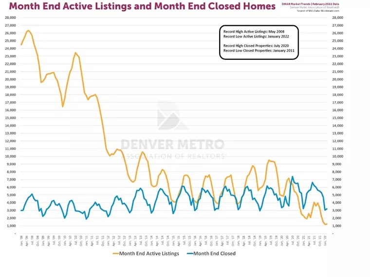 A graphic from the report, which runs from January 2008 to January 2022, puts the assorted factors in perspective. The yellow line corresponds to active listings at the end of each month, while the blue line shows sales that closed over the same periods: