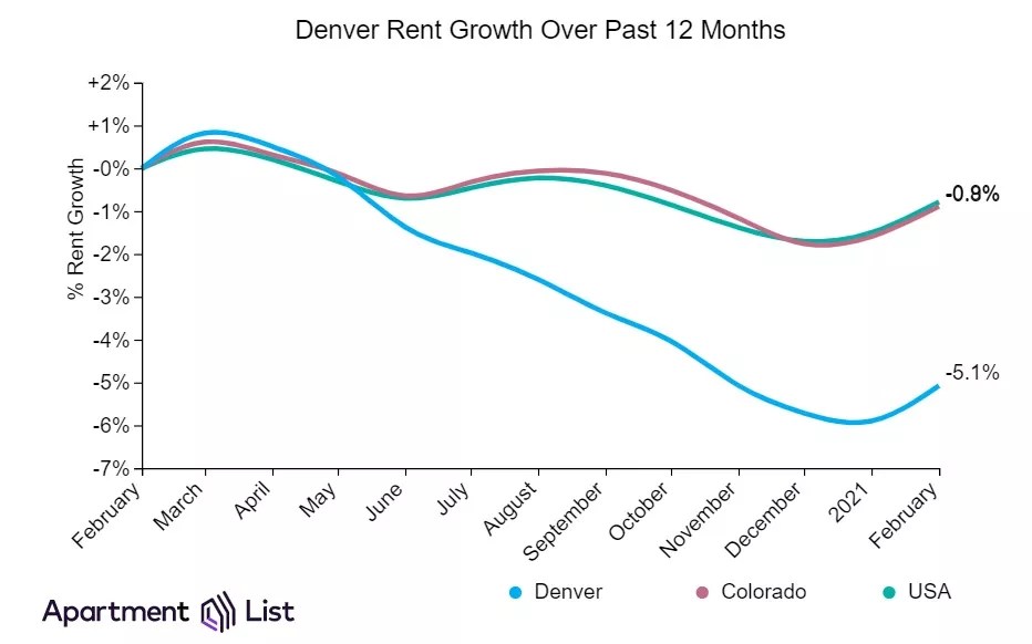 This graphic shows what’s been happening to Denver rent since February 2020, just prior to restrictions and shutdowns related to COVID-19.