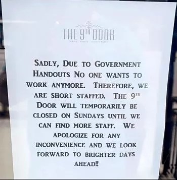 “Sadly, due to government handouts no one wants to work anymore. Therefore, we are short staffed. The 9th Door will temporarily be closed on Sundays until we can find more staff. We apologize for any inconvenience and we look forward to brighter days ahead!!”