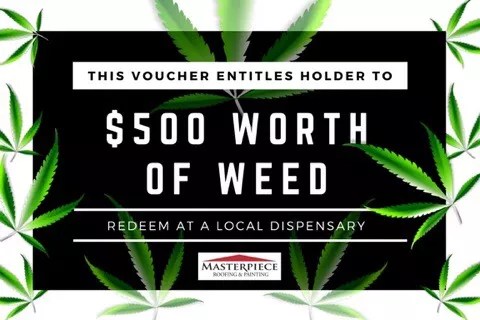 Masterpiece Roofing and Painting owner Rex “the Roofer” Corley (though he’s starting to confuse that moniker with “the Reefer” lately) released a video on the company’s Facebook page over the weekend announcing the unique promotion. Appearing with fellow roofer Zach Blenkinsopp – known for recently offering a free AR-15 rifle to customers buying a roof from his company in Alabama – Corley offers potential clients $500 in marijuana dispensary vouchers.
