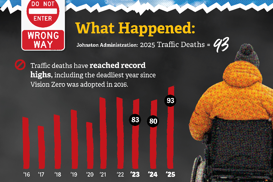 On January 22, Johnston released a 2025 “scorecard” evaluating how well he met goals in areas like safety, homelessness and affordable housing. According to his own measure, the mayor met nine out of his eleven goals, falling short in targets for homeless residents moved into permanent housing and the number of affordable units opened. Still, he gave himself a better score than bike, pedestrian and transit advocates in the city.