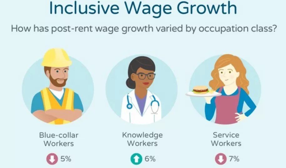 The national average of your findings show that blue collar workers’ post-rent wages – the wages left after rent has been deducted – are down by an average of 5 percent, service workers’ post-rent wages are lower by 7 percent and only knowledge workers have seen an increase, with their post-rent wages up 6 percent, over the decade between 2005 and 2015. What are the major factors for the decrease for blue collar and service workers, and the modest upswing for knowledge employees?