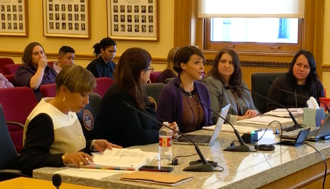 Senator Angela Williams (from left), Gena Ozols, Rebecca Zimmerman, Lydia Waligorski and Senator Faith Winter, testifying in the Colorado Legislature about domestic violence.