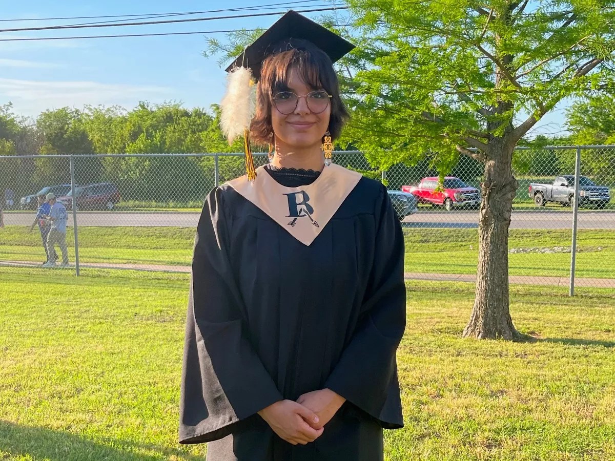 The sash – given to her by her older brother as a graduation gift – bears both the eagle and serpent emblem and red, white and green colors of the Mexican flag on the right and the stars and stripes of the American flag on the left.