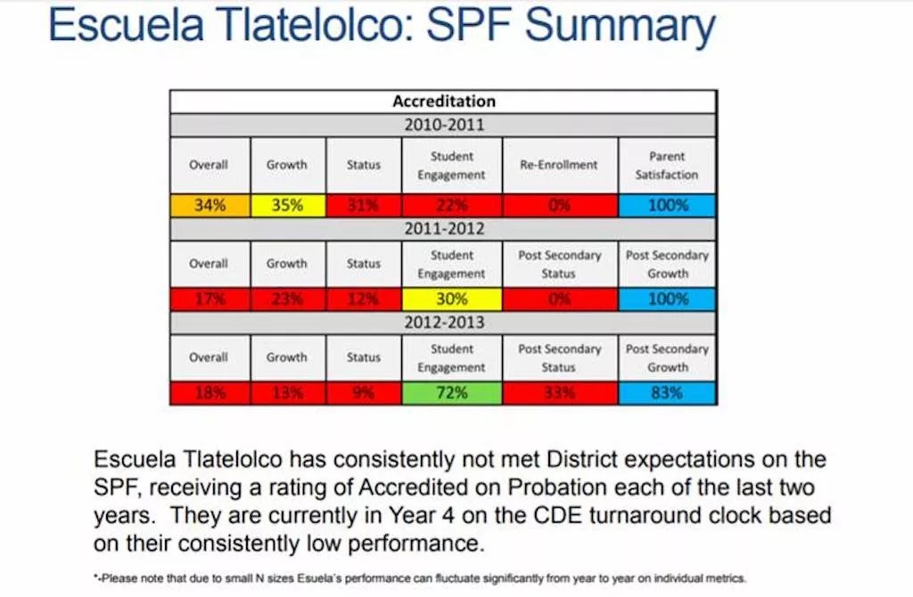 But Alex Renteria, a spokesman for DPS, points to the school’s consistently dismal scores in the district’s yearly School Performance Framework in student achievement and lack of progress over time. (The only standard that Escuela Tlatelolco consistently met or exceeded was parent engagement and satisfaction.) “We hold ourselves and our schools to a high standard,” says Renteria.