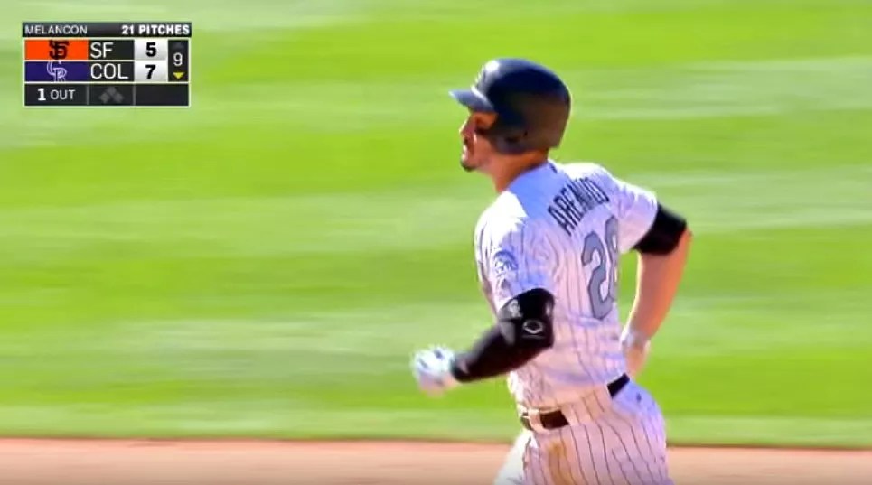 Nolan Arenado rounding the bases after completing the cycle with a walk-off home run against the San Francisco Giants on June 18.