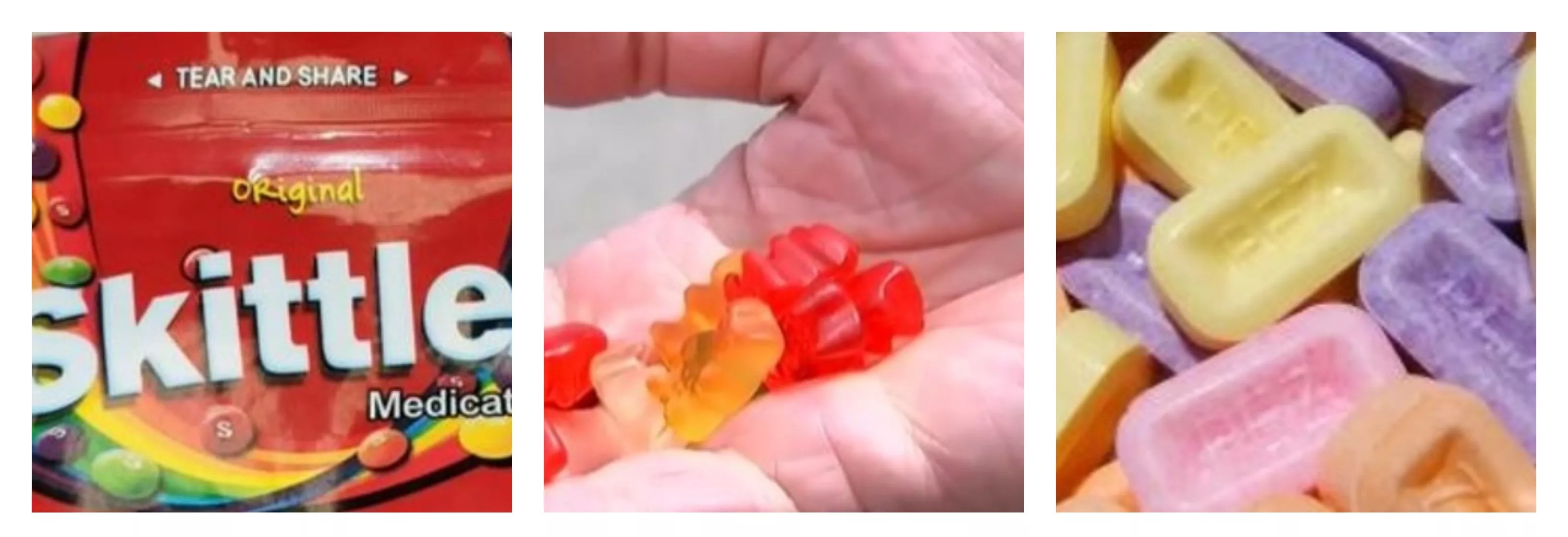 2022: Candy-shaped fentanyl circulating in southern (Portland) Maine; green and purple pills shaped like candy or vitamin-like alien heads and hand grenades.