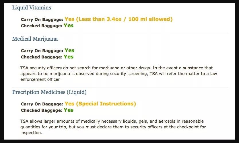 The basis for Angell’s tweets was an item on the TSA’s website that indicated a change in policy toward traveling with medical marijuana. Here’s a screen capture of the message.