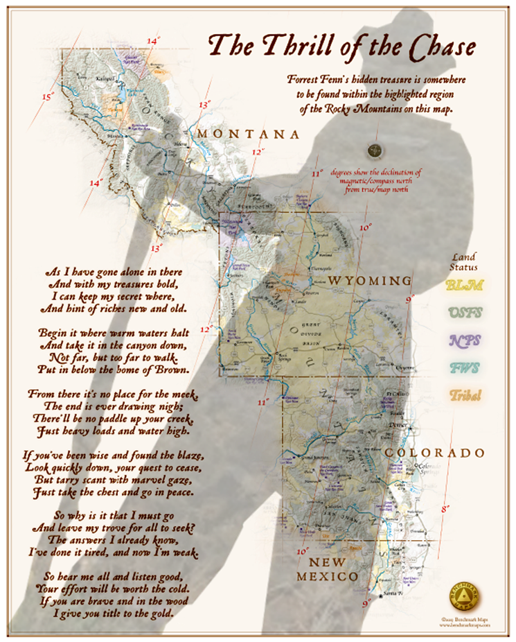 On his website, Fenn, who is in his eighties, describes his 2011 memoir, The Thrill of the Chase, as “the remarkable true story of Forrest Fenn’s life and of a hidden treasure, secreted somewhere in the mountains north of Santa Fe. The book contains clues to the treasure’s location.” Specifically, they’re in a poem whose key stanza reads, “Begin it where warm waters halt/And take it in the canyon down/Not far, but too far to walk/Put in below the home of Brown.”