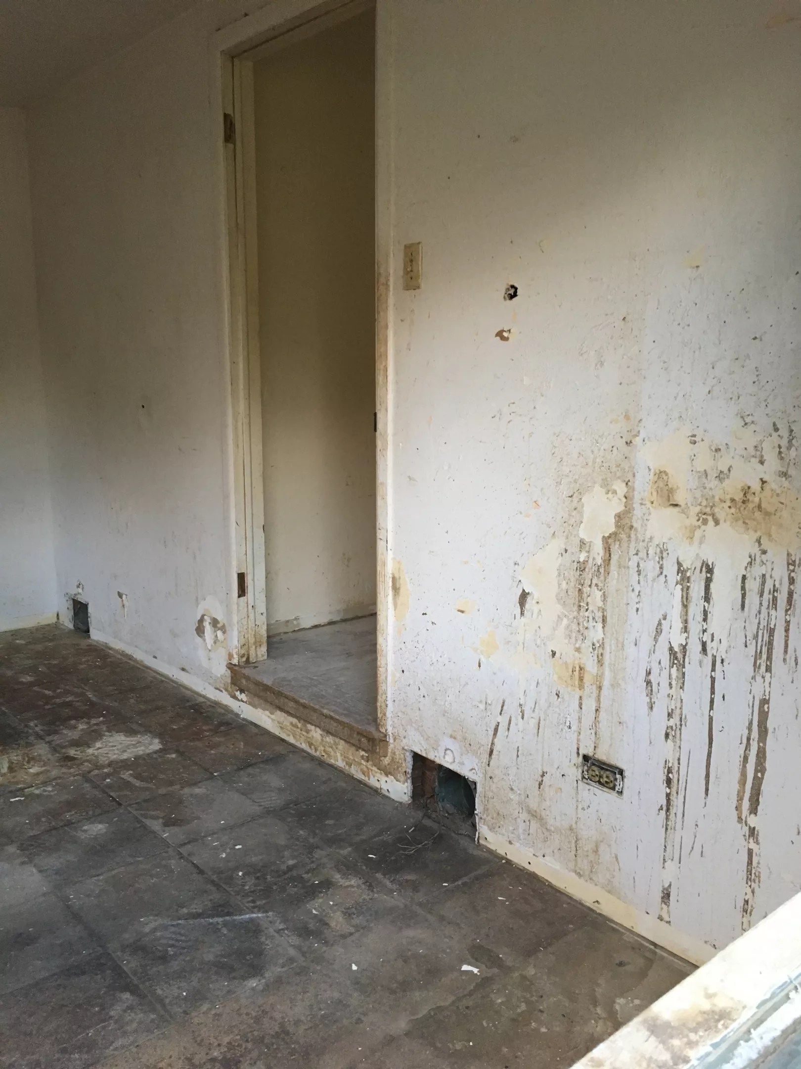 The windows have been removed from the house, so it’s easy to see the damage inside.
