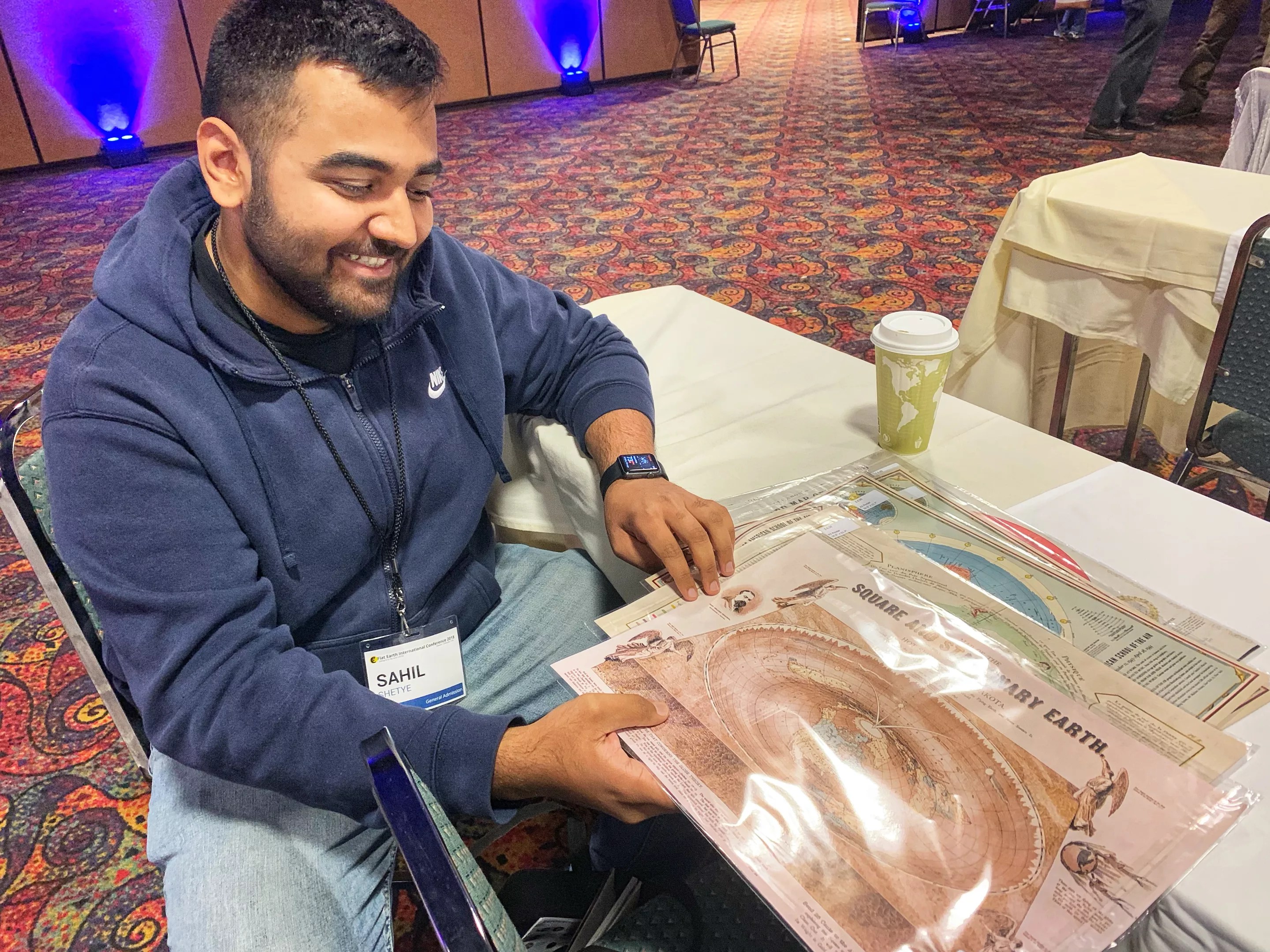 Sahil Shetye, who works in the renewable-tech sector, came all the way from Chicago for the conference. “I’m fascinated by people who think the Earth is flat,” he says.