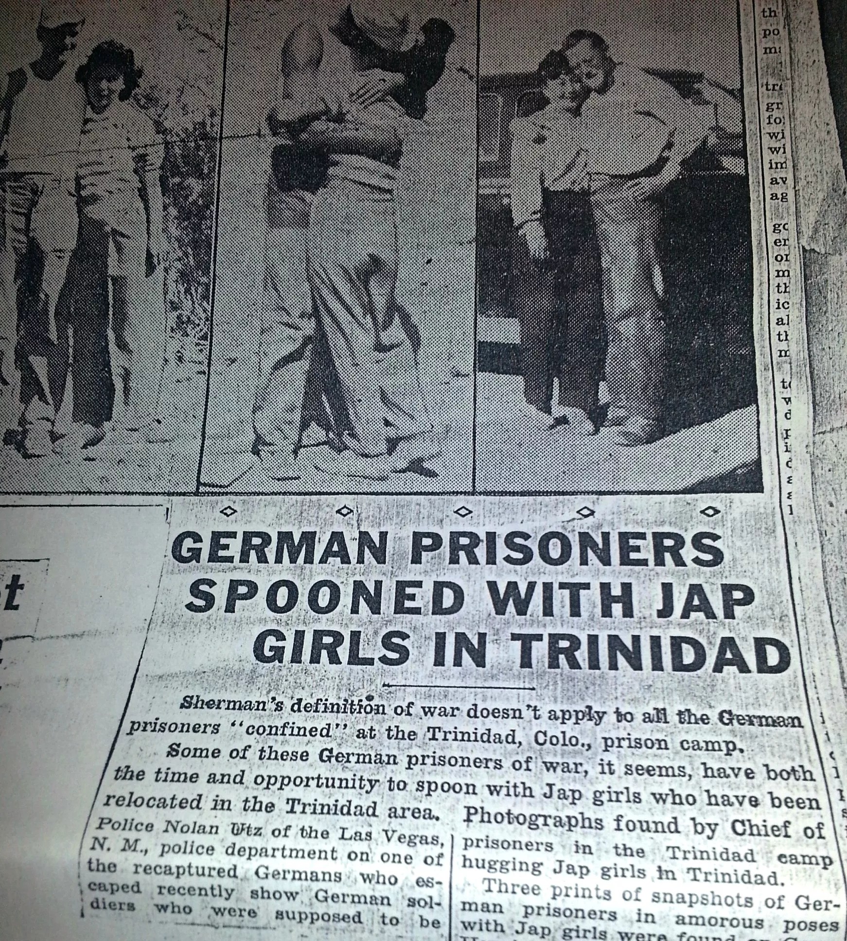 Then all hell broke loose. On October 15, six POWs, including two officers, pulled a disappearing act. Traveling in pairs, they were all rounded up over the next week near towns in northern New Mexico – Springer, Maxwell, Watrous. One of the men, Heinrich Haider, had photographs in his possession that showed him and another prisoner embracing Japanese-American women. Haider refused to say anything about the photos, but investigators suspected – correctly, it turned out – that the women had aided his escape.