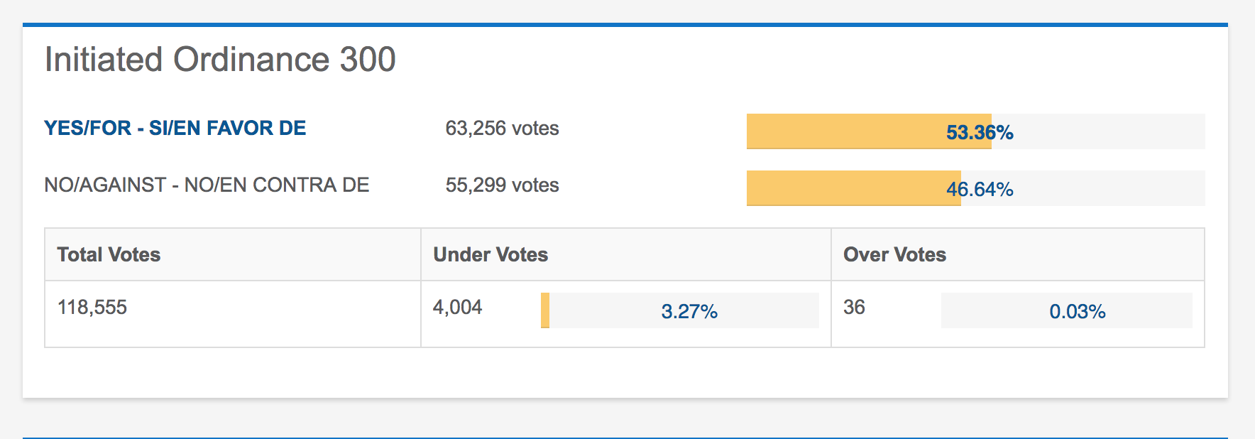 Against the odds, I-300 passed. As of 5 p.m. November 9, 63,256 votes had been counted in favor of I-300 – which accounts for 53.36 percent of those who voted in Denver.